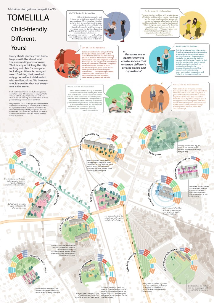 The jury Kristin Gausdal, Alexander Marek, Lisa Klingwall and Felix Heuman: praised the winning proposal for its comprehensive approach to making Tomelilla a child-friendly city. By catering to diverse personality types and integrating separate places into an urban whole, the proposal stood out as a visionary contribution to ASF-Sweden’s mission.